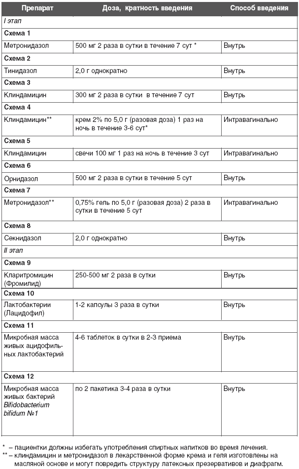 На первом этапе лечения следует проводить местную антибактериальную терапию препаратами с антианаэробным действием (метронидазолом, клиндамицином, левомицетином и др.), направленными на снижение количества анаэробных микроорганизмов. Применяют молочную кислоту для снижения рН, лазеротерапию; по показаниям – иммунокорректоры, эстрогены, ингибиторы простагландинов и антигистаминные препараты. При наличии зуда, жжения, боли назначают местно анестезирующие препараты.