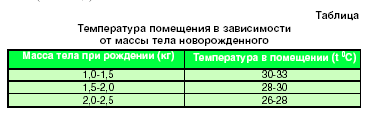Особое значение для проведения реанимации недоношенных детей имеет соблюдение «тепловой цепочки» новорожденного. Жировая клетчатка таких детей слабо выражена, соотношение площади поверхности тела и массы достаточно высоко, им сложно осуществлять полноценную терморегуляцию организма. С учетом этого желательно первичную помощь новорожденным проводить в инкубаторе открытого типа с системой сервоконтроля, в котором интенсивность обогрева ребенка строго контролируема и зависит от заданной температуры. Гипертермия способствует пренатальной дыхательной депрессии, гипотермия – развитию внутрижелудочковых кровоизлияний. При отсутствии источника лучистого тепла необходимо создать комфортную температуру во всем помещении (таблица).