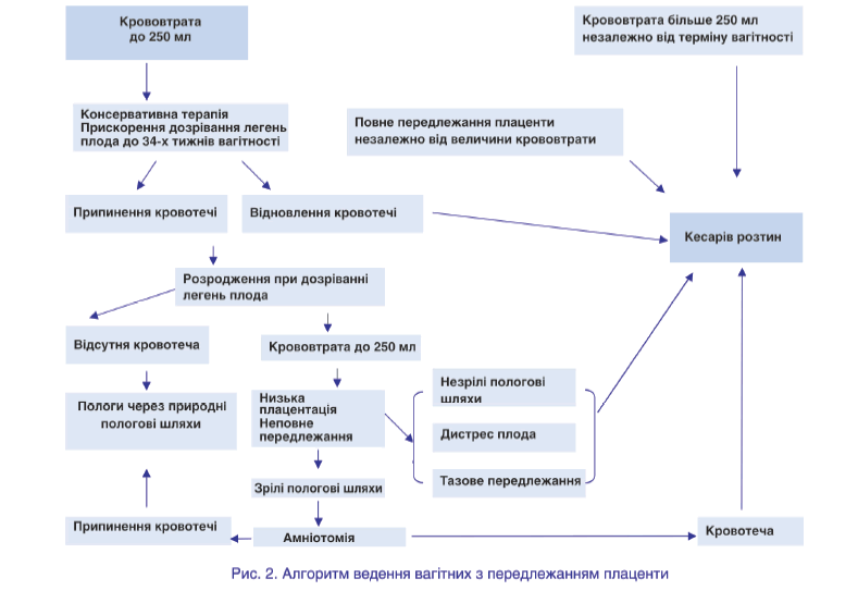 Передлежання плаценти – ускладнення вагітності, при якому плацента розташовується у нижньому сегменті матки нижче передлеглої частини плода, перекриваючи повністю або частково внутрішнє вічко шийки матки. При фізіологічній вагітності нижній край плаценти не досягає 7 см до внутрішнього вічка. Передлежання плаценти відмічається у 0,2-0,8% загальної кількості пологів (рис. 2).