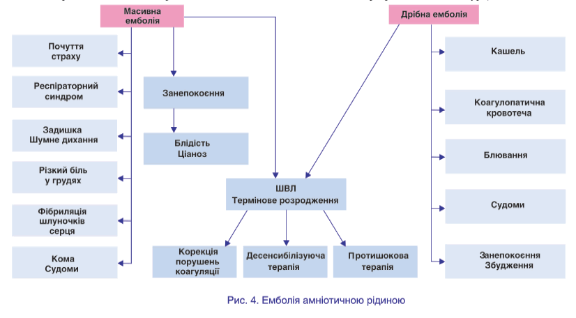 Емболія амніотичною рідиною – критичний стан, який виникає у разі проникнення елементів навколоплодових вод у кровоток матері та супроводжується розвитком гострої серцево-легеневої недостатності або зупинки кровообігу (рис. 4).