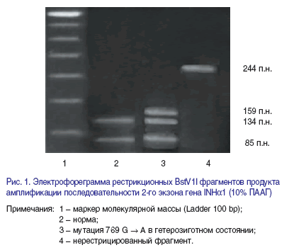 При отсутствии мутации (дикий тип) после рестрикционного анализа мы наблюдали фрагменты 85, 25 и 134 п.н., в случае мутации 769G->A в гомозиготном состоянии – фрагменты длиной 85 и 159 п.н. (рис.1).