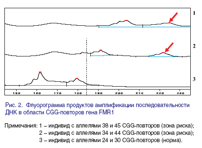 Для идентификации количества СGG-повторов в гене FMR1 Cy-5 меченые продукты ПЦР анализировали на автоматическом лазерном флуориметре ALF-express (рис. 2).