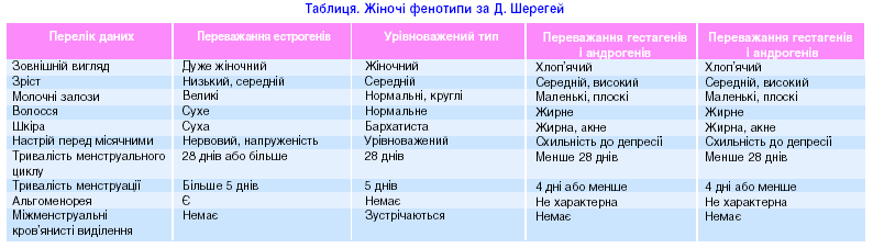 Враховуючи різний вміст гестагенів у КОК, небхідно з'ясувати, які гормони у жінки переважають, та залежно від цього підбирати конкретний контрацептивний засіб. Орієнтовно жіночий фенотип можна вирахувати за таблицею, запропонованою Д. Шерегей (таблиця).