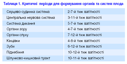 Протягом періоду внутрішньоутробного розвитку плода, враховуючи ризик виникнення порушень, залежно від терміну дії та характеру пошкоджуючого фактора, виділяють так звані критичні періоди внутрішньоутробного розвитку, коли ризик виникнення порушень та патології плода є надзвичайно високим (табл. 1). Важливо, що переважну більшість факторів ризику можна своєчасно визначити та попередити їх несприятливу дію.