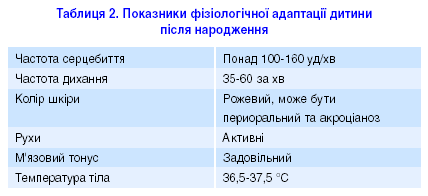 З метою оцінки стану дитини при народженні визначають показники адаптації (табл. 2): крик немовляти, колір шкіри, активність, тонус м’язів тощо. Оцінюють також відсутність ознак вродженої інфекції та вроджених аномалій розвитку, що потребують медичного втручання.