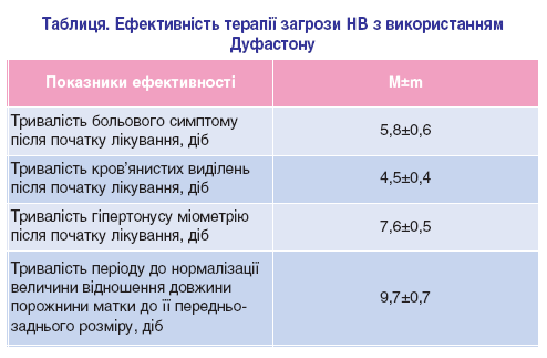 Клінічні спостереження показали, що покращання самопочуття пацієнток, зокрема зникнення больового симптому, відзначалось вже через 5,8±0,6 доби від початку прийому Дуфастону. Тривалість кров’янистих виділень після початку лікування складала 4,5±0,4 доби, наявність ехографічних ознак загрози переривання вагітності, гіпертонусу міометрію – 7,6±0,5 доби. У середньому через 9,7±0,7 доби величина відношення довжини порожнини матки до її передньо-заднього розміру наближалася до такої при неускладненому перебігу вагітності (1,4±0,05, р<0,05) (таблиця).