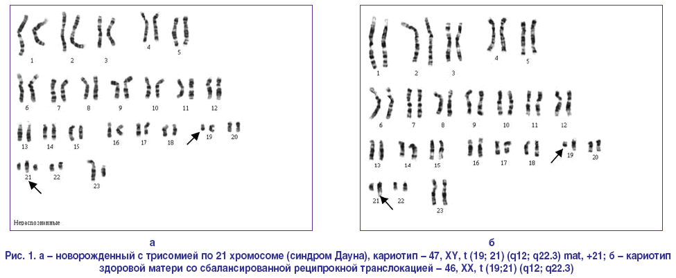 Сбалансированная транслокация в кариотипе фенотипически здоровой матери была установлена в нашей клинике только после цитогенетического подтверждения синдрома Дауна у ребенка. По литературным данным [7], частота анеуплоидий по другим хромосомам X, Y, 13, 15, 16, 17, 18, 21 и 22 гамет, в частности сперматозоидов, существенно выше у пациентов с аномальным, хоть и сбалансированным, кариотипом.