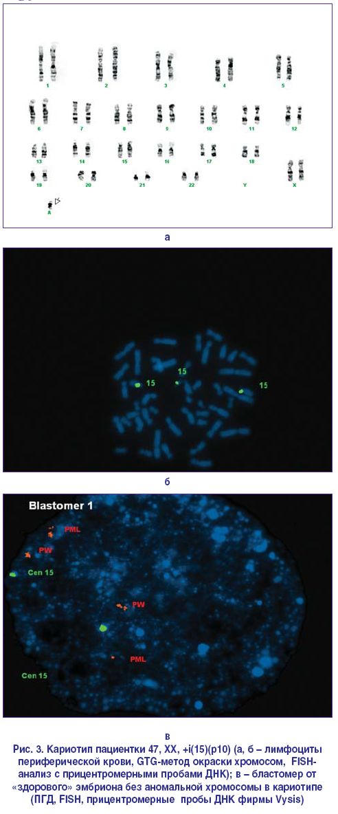 Случай 1. В клинику обратилась женщина с отягощенным акушерским анамнезом (три беременности, замершие на ранних сроках). До этого в течение 10 лет лечилась в различных клиниках ВРТ, прошла несколько неудачных попыток ЭКО. Забеременеть она смогла только после проведения в нашей клинике полного молекулярно-цитогенетического обследования, включающего кариотипирование самой пациентки с точной идентификацией методом FISH-анализа аномальной лишней хромосомы, которая присутствовала в ее кариотипе (рис. 3а, б). Методом выбора при такой хромосомной аномалии могла быть только ПГД (как альтернативный метод донации ооцитов). Селекция нормальных эмбрионов была произведена на стадии 8 бластомеров. В полость матки перенесены только те эмбрионы, которые не содержали аномальной хромосомы (рис. 3в).