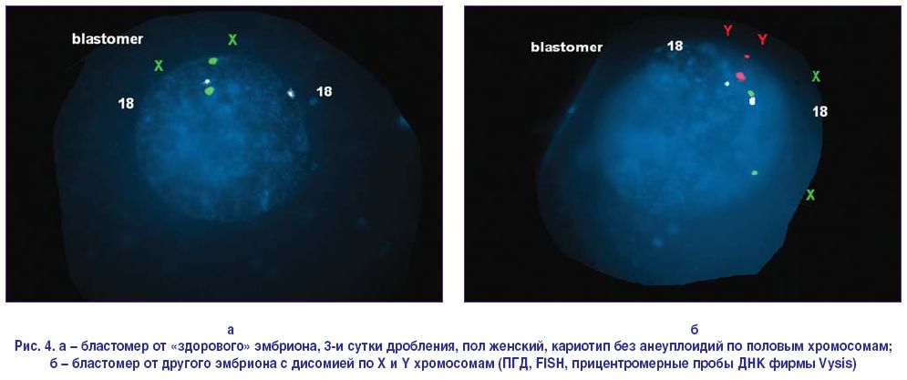 Случай 2. Супружеская пара наблюдалась в клинике по поводу бесплодия. В анамнезе – несколько неудачных попыток ЭКО. Цитогенетическое обследование показало у обоих супругов нормальный кариотип (у мужа – 46, XY, у жены – 46, ХХ). Однако беременность не наступала. Для увеличения эффективности программы ЭКО за счет «отсева» эмбрионов с числовыми аномалиями в кариотипе супругам была рекомендована процедура ПГД (рис. 4). Она была успешно проведена. Среди всех бластомеров, взятых по одному от каждого из 7 эмбрионов, 3 были с нормальным набором хромосом, а остальные 4 – с анеуплоидиями в кариотипе (моносомия по Х, дисомии по Х и Y хромосомам). Лучшие эмбрионы были перенесены в полость матки; наступила долгожданная беременность с последующим рождением в срок здоровой девочки.