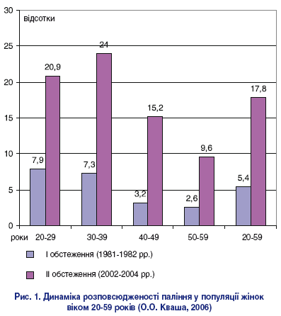 В Україні сьогодні, за даними НДІ кардіології ім. М.Д. Стражеска АМН України (І.П. Смирнова та співавт., 2004), курять 47,8% чоловіків і 17,8% жінок працездатного віку. Слід зазначити, що за останні 20 років спостерігається негативна тенденція до збільшення цього показника серед жіночого населення всіх вікових категорій (у середньому у 3,3 разу) [3], особливо серед жінок віком 40-49 років (у 4,7 разу) та 50-59 років (у 3,7 разу) (рис. 1).