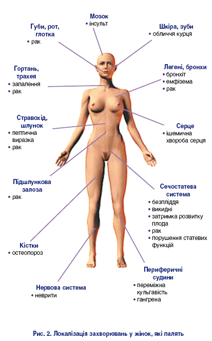 Сьогодні із тютюнокурінням пов’язане катастрофічне зростання серцево-судинних захворювань, хвороб органів дихання, онкологічної патології. За прогнозами експертів ВООЗ (2003), при нинішніх темпах розповсюдженості в Україні вже до 2020 р. кількість летальних наслідків від паління сягне 22%. На фоні деякого зменшення відсотка чоловіків-курців швидкість збільшення кількості курців серед жіночого населення набуває загрозливих розмірів.