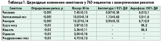 Вначале мы рассматривали данные всех 765 пациентов, их хронограммы и косиноры (табл. 1) показали одинаковые результаты. Статистически важные циркадные ритмы с утренним пиком в 6 часов отмечены для таких симптомов, как чихание, заложенность носа и насморк. Для других симптомов, включая зуд в носу, кашель, одышку и раздражение глаз, циркадные ритмы не определяли.