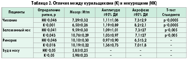 Некурящие или редко курящие (от ноля до четырех сигарет в день) составили подгруппу из 582 пациентов, курильщики (пять и более сигарет в день) сформировали меньшую подгруппу. Интересно, что чихание было более раздражающим симптомом у тех, кто не курил, заложенность носа доминировала у курильщиков (вариационный анализ р<0,005). Что касается интенсивности насморка, то здесь не отмечено никаких различий между курильщиками и некурящими (табл. 2).