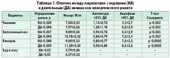 Были обнаружены статистически важные циркадные ритмы для трех основных симптомов у пациентов с недавней и длительной историей аллергического ринита. Тем не менее интенсивность симптомов была более выражена у недавно диагностированных пациентов по сравнению с теми, у кого заболевание наблюдалось достаточно долго. Косинорный анализ (табл. 3) подтвердил циркадную ритмичность и статистически важные более высокие значения мезора для чихания, заложенного носа и насморка в новых случаях по сравнению с существующими случаями заболевания.