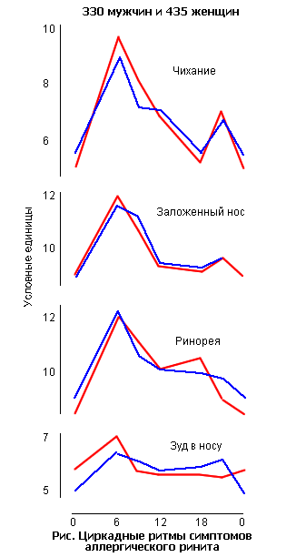 Периодические изменения частоты и интенсивности симптомов ринита в зависимости от времени суток на протяжении 24 часов наблюдал Trousseau еще в 1865 году. Утреннее превалирование симптомов и ритмичность их изменений на протяжении суток позволили ему считать ринит разновидностью астмы, поражающей нос (L’asthme du nez).