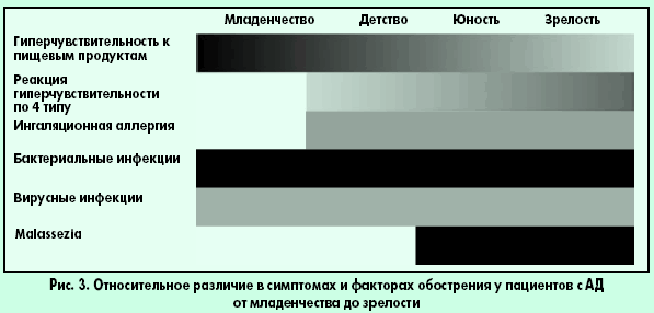 У 45% детей первый эпизод АД происходит в первые 6 месяцев жизни, у 60% – в течение первого года жизни. До 5-летнего возраста, по крайней мере, 85% детей имеют в анамнезе эпизоды АД. Если заболевание начинается до 2-летнего возраста, его симптомы персистируют у 20% детей, у 17% таких детей наблюдаются интермиттирующие симптомы до 7-летнего возраста (рис. 1).