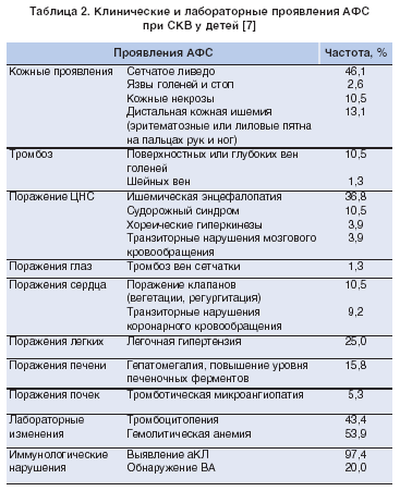 Спектр клинических и лабораторных признаков АФС при СКВ у детей представлен в таблице 2. У детей с СКВ и АФС по частоте преобладает тромбоз мелких сосудов кожи. Кожные симптомы могут быть первым его проявлением у пациентов, у которых в дальнейшем развивается мультисистемный тромбоз.