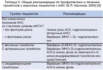 Профилактика рецидивирования тромбозов. У больных с высоким уровнем аФЛ-АТ, но без клинических признаков АФС можно ограничиться назначением небольших доз (1-2 мг/кг/сут – 50-100 мг/сут, в среднем 75 мг/сут) ацетилсалициловой кислоты (АСК) (табл. 3). Эти пациенты требуют тщательного амбулаторного мониторинга, так как риск тромбозов у них весьма высок. Наиболее эффективен для профилактики тромбоза любой локализации сочетанный прием варфарина (МНО=1,5) и АСК в низких дозах [6]. Вместе с тем при лечении антикоагулянтами высок риск развития осложнений, в связи с чем необходимы регулярный лабораторный контроль и динамическое наблюдение за больным. Противопоказаниями к их приему являются беременность (могут вызывать нарушение развития нервной системы у плода) и язвенные заболевания ЖКТ; данные средства следует с осторожностью применять при поражении печени или почек.
