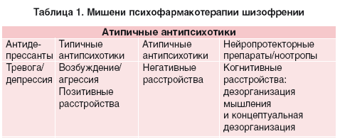 Мишени современной психофармакотерапии шизофрении представлены в таблице 1.