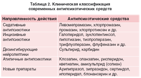 Подбор антипсихотических средств осуществляют в зависимости от их клинических свойств. С.Н. Мосолов предлагает использовать следующую клиническую классификацию традиционных и современных антипсихотических средств (табл. 2) [15].