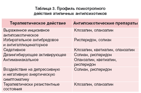 Атипичные антипсихотки различаются между собой по профилю психотропного действия (табл. 3).
