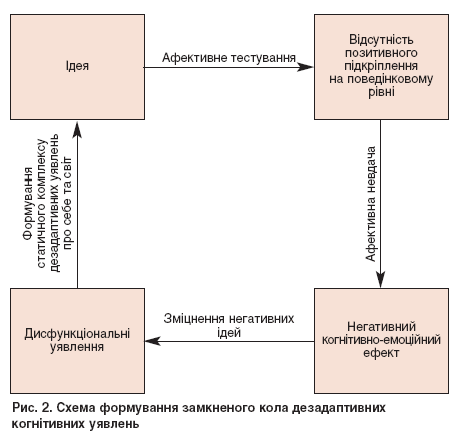У дітей та підлітків із депресією відмічається значно занижена самооцінка, а також пов'язане з нею голотимне сприйняття минулих і теперішніх подій. Діти з афективними розладами надмірно узагальнюють ефекти негативних подій, очікуючи трагічних наслідків. Вони зосереджені виключно на негативних сторонах і почувають себе відповідальними за них [27, 28]. Через почуття недостатньої компетентності та втрати контролю (передусім зовнішнього) такі діти не здатні отримувати задоволення від результатів власних дій, що в свою чергу призводить до формування та прогресування порушень мотиваційної та вольової сфери. Внаслідок цього утворюється порочне коло дисфункціональних ідей та уявлень, так званий когнітивний дальтонізм: життєва невдача (зовнішня активуюча подія) – думка про нездатність подолати проблему (ідея) – бездіяльність або пасивність у її вирішенні (форма поведінки) – розчарування у власних силах (емоційні наслідки дезадаптивних ідей та поведінки) – когнітивне переформування ідеї про власну неспроможність у статично негативне уявлення про себе, не пов'язане з актуальними подіями та без об'єктивних підтверджень (рис. 2)1.