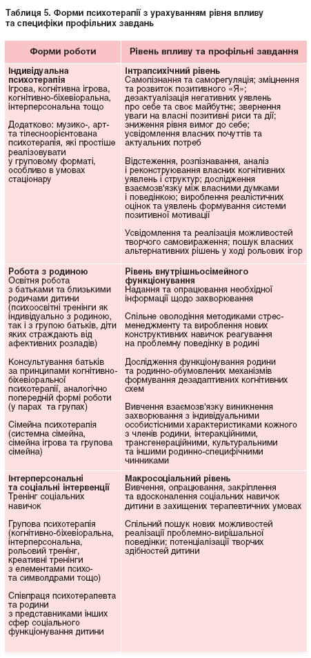 В таблиці 5 наведені рекомендовані форми психотерапії з урахуванням рівня впливу та специфіки профільних завдань.