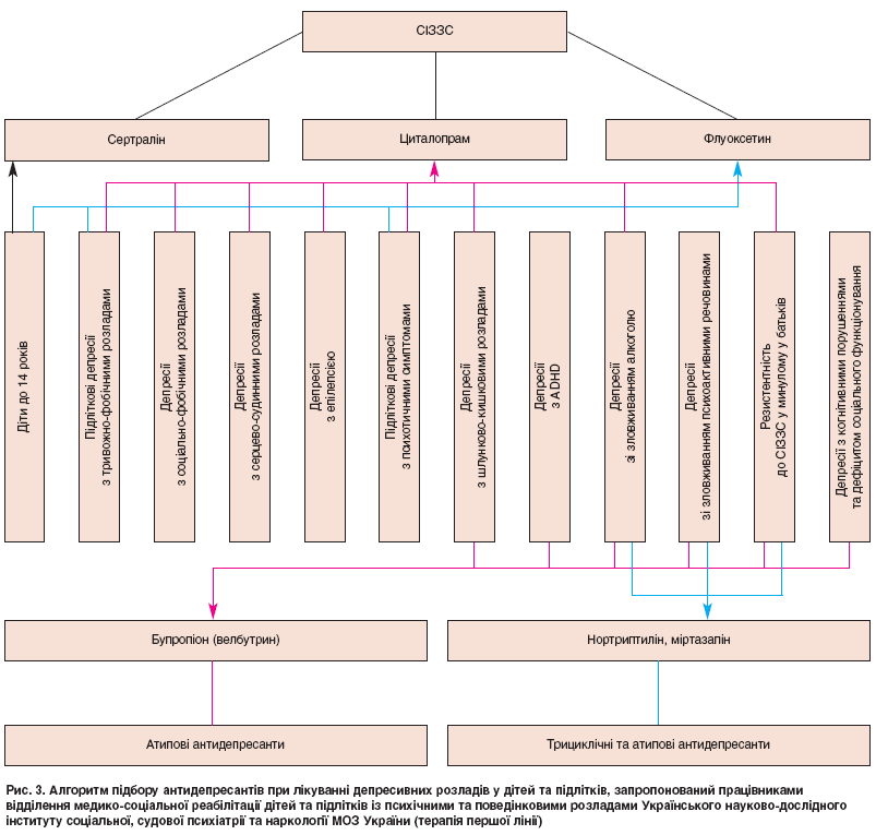Докладний алгоритм підбору антидепресивної терапії, розроблений працівниками відділення медико-соціальної реабілітації дітей та підлітків із психічними та поведінковими розладами Українського науково-дослідного інституту соціальної, судової психіатрії та наркології МОЗ України, наведено в рисунку 3. При побудові алгоритму були використані пропозиції C. Kye & N.D. Ryan [21] та E.B. Keller & R.A. Keller [22].