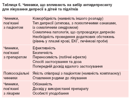 Чинники, які відіграють важливу роль у виборі препарату для лікування дитячо-юнацької депресії, представлені в таблиці 6.