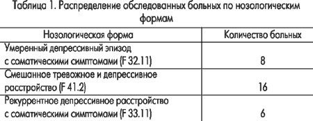 Было обследовано 30 больных с психопатологическими расстройствами аффективной сферы, представленными тревожными и депрессивными нарушениями различной степени тяжести, в возрасте от 45 до 65 лет. Из них мужчин — 11 человек, женщин — 19. Все больные находились на стационарном лечении в отделении неврозов Центральной клинической больницы № 5 г. Харькова.