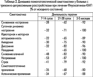 Оценка динамики состояния психической сферы больных, представленная в таблице 2, показала следующее. У пациентов, получавших Флуоксетин-КМП, к 7-му дню исследования существенно улучшался спектр ощущений, повышались настроение и физическая активность. К 14-му дню зафиксировано значительное снижение астенической, тревожной и депрессивной симптоматики, в частности витальных ее компонентов, утомляемости, слезливости, раздражительности, гиперестезий, беспричинных страхов или опасений за состояние своего здоровья. У большинства больных были купированы диссомнические расстройства, антивитальные переживания. К концу 4-недельного курса применения Флуоксетина-КМП полностью исчезли соматизированные проявления депрессии: болевые ощущения и соматовегетативные дисфункции.