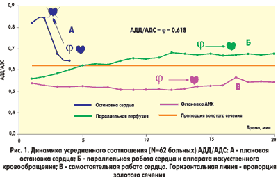 Изменения во времени соотношения АДД/АДС приведены на рисунке 1. Из графика видно, что после запуска сердца и при его функционировании параллельно с насосом АИК (кривая Б), начиная примерно с 12-й минуты параллельной перфузии, величина соотношения АДД/АДС стабилизируется и становится несколько больше (j=0,618) пропорции золотого сечения.