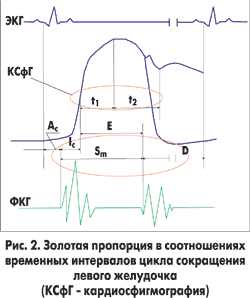 Вместе с тем, соотношения показателей цикла механического сокращения: Sm/D — длительность работы и отдыха ЛЖ; t1/t2 — длительность роста давления в аорте (t1) к длительности периода его снижения (t2) во время систолы четко продемонстрировали тенденцию к их группированию в пределах пропорции золотого сечения.