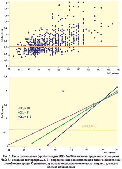 Нами выделены три типа зависимости соотношения Sm/D от ЧСС (рис.3,Б): для сердца с различной насосной способностью — высокой, нормальной и сниженной. По данным регрессионного анализа для первого типа золотая пропорция отношения Sm/D выполнена при ЧСС=78 уд/мин; для второго — 91 уд/мин и для третьего — 113 уд/мин при хронической недостаточности кровообращения, которая формировалась в течение достаточно длительного времени.