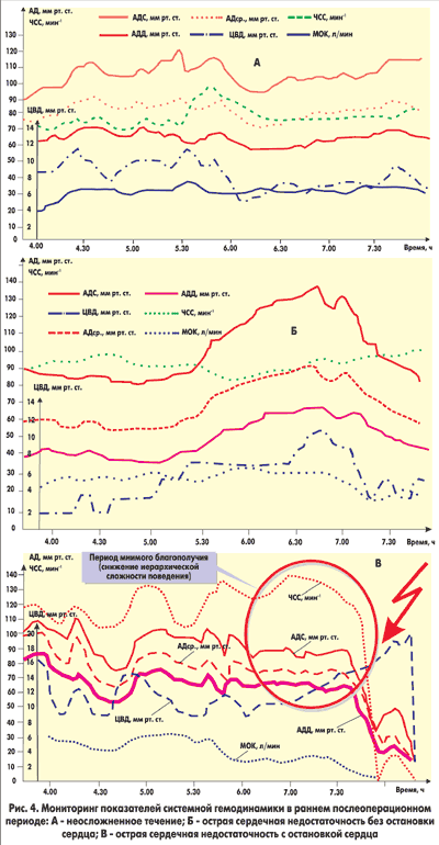 Мониторинговые кривые больного с ОСН, приведшей к остановке сердца, представлены на рисунке 4,В. Примерно за час до остановки сердца показатели АДД и ЧСС стабилизируются и некоторое время остаются практически неизменными.