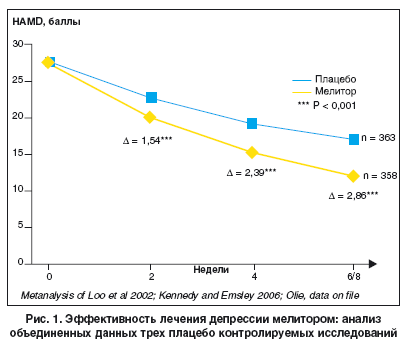 Метаанализ трех исследований показал достоверные различия между Мелитором и плацебо по данным основных методов анализа эффективности – шкалы Гамильтона для исследования депрессии (HAMD), где были получены значения D = 2,86 ± 0,56 балла (P < 0,001), и шкалы общего клинического впечатления о тяжести депрессии (CGI): D = 0,47 ± 0,10 балла (P < 0,001). Достоверные отличия между Мелитором и плацебо были отмечены уже со второй недели терапии (рис. 1).