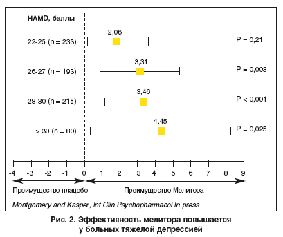 Кроме того, эффективность Мелитора при тяжелой депрессии была подтверждена метаанализом подгруппы больных, у которых общий бал по HAMD до лечения составлял 25 баллов и более. Анализ объединенных данных показал, что различия между Мелитором и плацебо возрастают с увеличением тяжести депрессии (рис. 2).