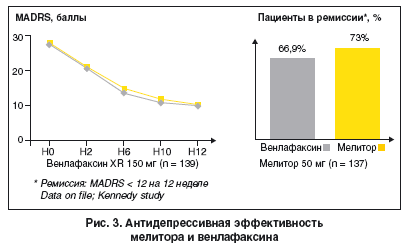 Также для оценки антидепрессивной эффективности Мелитора было проведено два исследования с прямым сравнением Мелитора и венлафаксина. Мелитор показал высокую эффективность в сравнении с венлафаксином как через 6, так и через 12 недель терапии, при этом число пациентов, достигших ремиссии, в группе Мелитора было больше (рис. 3).