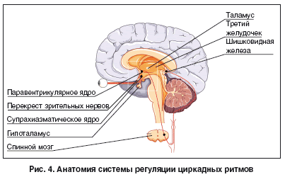 У всех живых существ циркадные ритмы соответствуют периоду около 24 часов. Смена дня и ночи определяет ритмические изменения поведения, физиологических и психических функций, например интенсивности обменных процессов, температуры тела, секреции гормонов, цикла сон-бодрствование. Все циркадные ритмы подчиняются и регулируются биологическими часами, которые у млекопитающих находятся в супрахиазматическом ядре (СХЯ) переднего гипоталамуса (рис. 4).
