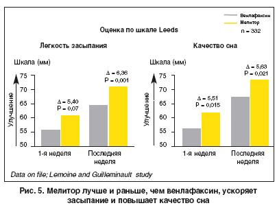 Мелитор благодаря своим уникальным фармакологическим свойствам агониста мелатонинергических рецепторов и антагониста 5-НТ2С-рецепторов при лечении глубокой клинической депрессии улучшает сон и не подавляет сексуальную функцию. По данным одного из исследований, прием 25 мг Мелитора увеличивал длительность медленно-волнового сна и нормализовал его периоды в течение ночи (Р < 0,05), не влияя при этом на фазу сна с быстрыми движениями глаз (REM-сон). В другом исследовании был показан сопоставимый антидепрессивный эффект при приеме 25-50 мг Мелитора или 75-150 мг венлафаксина. В то же время, по данным опросника, уже после первой недели лечения Мелитором существенно сокращался период засыпания (Р < 0,007) и повышалось качество сна (Р < 0,015). Это улучшение сохранялось на протяжении всего 6-недельного периода исследования и сопровождалось улучшением активности больных в дневные часы (рис. 5).