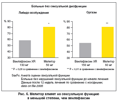 Сравнение состояния сексуальной функции у больных депрессией при терапии Мелитором или венлафаксином в течение 12 недель показало более благотворное влияние на сексуальную функцию Мелитора (50 мг/сут) по сравнению с венлафаксином (150 мг/сут). При этом выраженность антидепрессивного эффекта данных препаратов существенно не различалась (рис. 6).