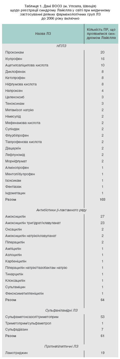 Натепер синдром Лайєлла залишається недостатньо вивченим. Його етіологію зазвичай важко визначити, але у 30-50% випадків його виникнення пов’язують із застосуванням ЛЗ. Серед препаратів, здатних спричинити появу і розвиток синдрому Лайєлла, виділяють антибіотики (зокрема β-лактамного ряду), нестероїдні протизапальні лікарські засоби (НПЗЛЗ), сульфаніламіди, протисудомні та ЛЗ інших фармакологічних груп (вакцини, сироватки, препарати γ-глобуліну крові) (табл. 1).