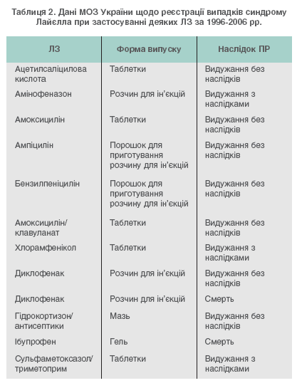В Україні протягом 1996-2006 рр. відділом фармакологічного нагляду Державного фармакологічного центру МОЗ України зареєстровано 12 випадків синдрому Лайєлла (табл. 2).