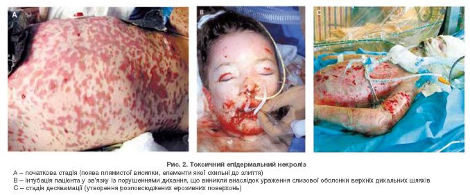 До можливих тяжких ургентних проявів побічних реакцій (ПР) з боку шкіри, що виникають, зокрема, при застосуванні лікарських засобів (ЛЗ), належать генералізована кропив’янка й ангіоневротичний набряк (набряк Квінке), гострі бульозні дерматози: мультиформна ексудативна еритема (МЕЕ), синдром Стівенса-Джонса (ССД) і синдром Лайєлла (розповсюджений токсичний епідермальний некроліз – ТЕН).