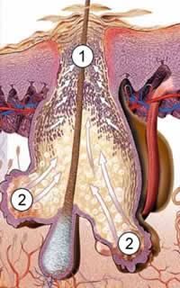 1. пробка в устье фолликула; 2. увеличенные сальные железы