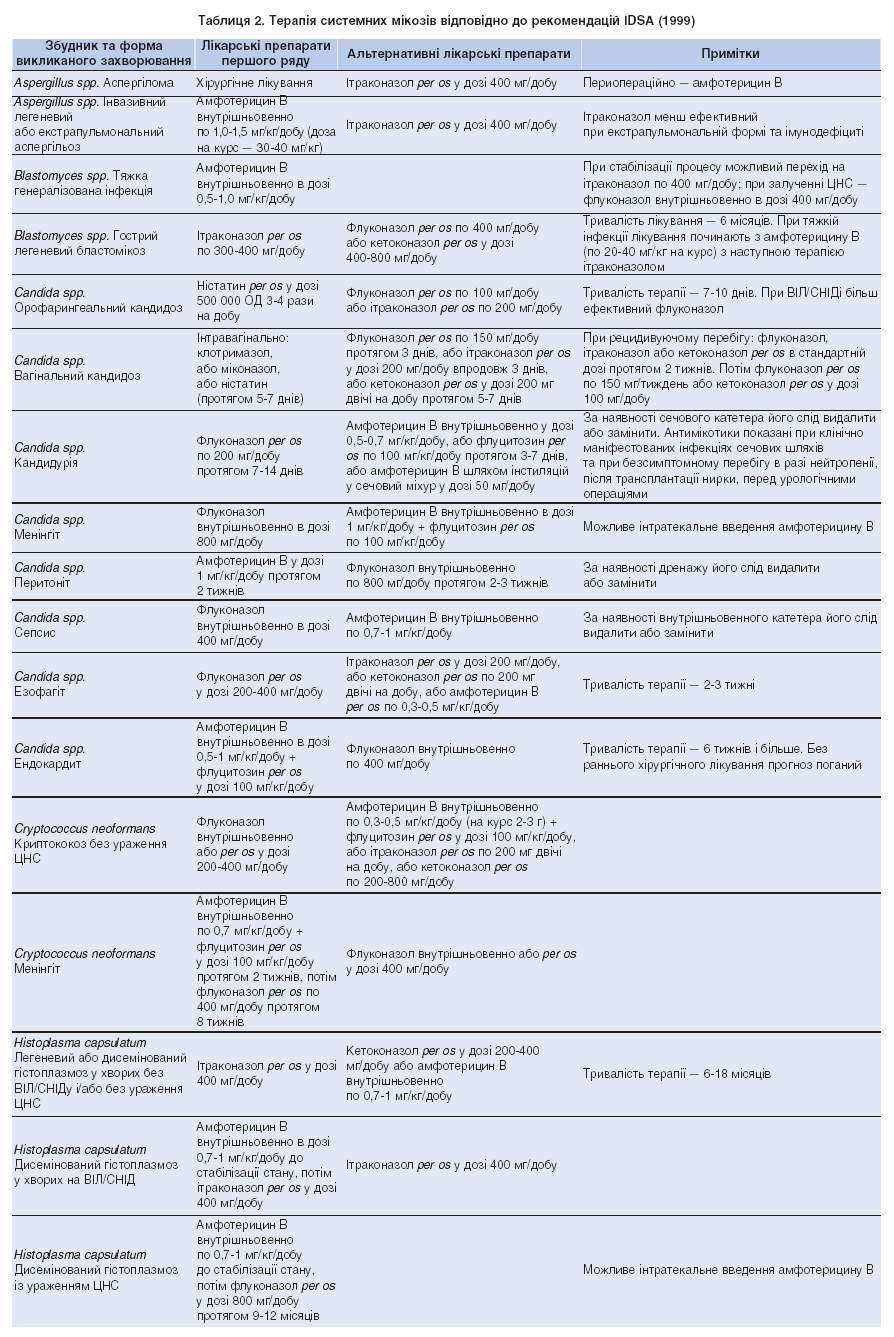 Як уже зазначалося, у зв’язку з прогресуванням поширення пандемії ВІЛ/СНІДу та імунодефіцитних станів іншого генезу відчутно зростає захворюваність на системні мікози. При їх терапії нині використовують амфотерицин В та препарати груп імідазолів і триазолів. Відповідно до рекомендацій Товариства інфекційних хвороб Америки (Infectious Disease Society of America, IDSA, 1999) та інших сучасних даних [6], лікування системних мікозів можна представити у вигляді зведеної таблиці (табл. 2).