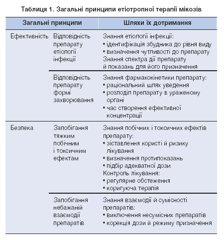 Загальні принципи лікування протигрибковими препаратами (антимікотиками) наведені в таблиці 1 [19].