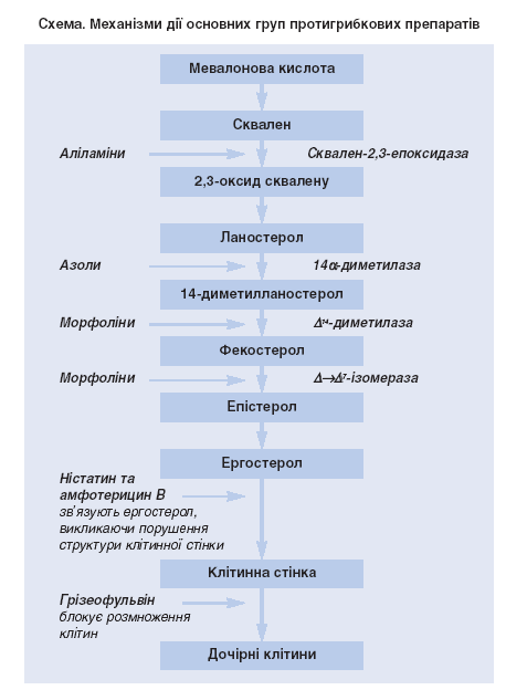 Безумовно, не всі наведені групи препаратів застосовуються в наш час однаково широко. На схемі показані основні механізми їх впливу на клітину гриба [6].