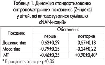 При повторному антропометричному обстеженні ми отримали дані, що свідчили про позитивну динаміку прибавки в масі тіла: середня тижнева прибавка маси тіла у дітей першої групи становила 219,5 г/тиждень, а відносна тижнева прибавка у масі тіла (у відсотках до маси на початку періоду) — 3,8% /тиждень. Якщо ж порівняти із середньою нормативною прибавкою за тиждень для кожної дитини відповідно віку, то вона становила 135,8%. Причому у дітей із відставанням у масі тіла вона була більш значною — 202,3%, з надлишком маси — 96,3%. Таким чином, вигодовування сумішшю «NAN-новий» мало нормалізуючий характер впливу на соматометричні показники. Цю тезу підтверджує динаміка стандартизованих показників (табл. 1).