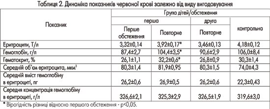 При обстеженні в динаміці у дітей першої групи спостерігалося вірогідне збільшення показників червоної крові: кількості еритроцитів, гемоглобіну та гематокриту, як відносно першого обстеження, так і відносно повторних даних другої групи (p<0,05) (табл. 2). У той же час ці показники суттєво не відрізнялися від гемограми дітей контрольної групи. Ми також не спостерігали різниці показників залежно від статі, яку відмічали окремі автори [23].